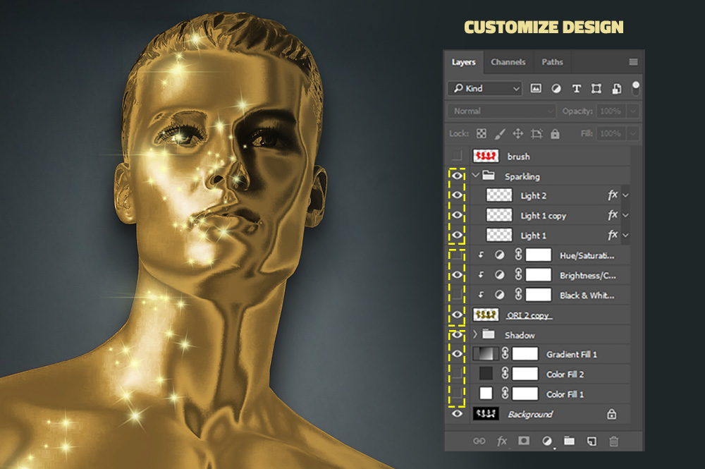 This action transforms your photos into professional Gold looking. You have lots of layer control to adjust your results. The action has been tested and working on Photoshop (English version only) CS4 – CC 2017. It?s only work on English versions of Photoshop.